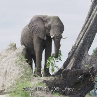 African Elephant standing on a mound, looking around and feeding on twigs.