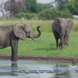 Memory of young and adult African Elephants standing, wading in water to cool off and drink up using their trunks.