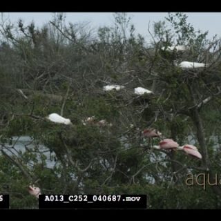 American Alligators laying down on riverbank and flocks of Roseated Spoonbills and Great Egrets standing and moving on trees MWS TU
