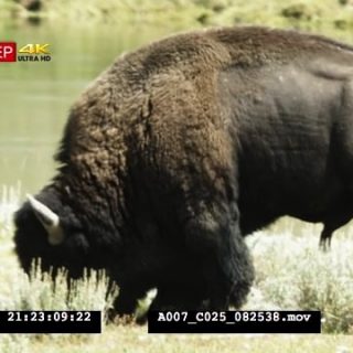 AMERICAN BISON LOOKING AT BROWN BEAR WALKING TOWARDS CAM