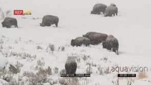 Bison herd standing and grazing on snowy prairie WS PAN