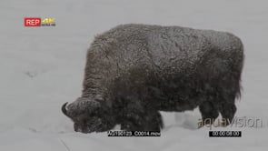 American bison bull scraping away snow grazing in snow covered field while snowing heavily