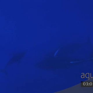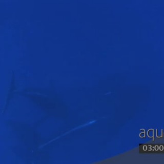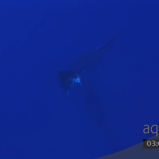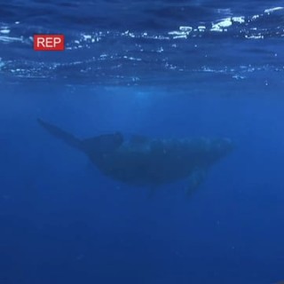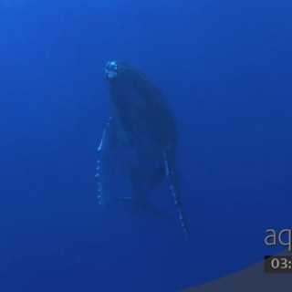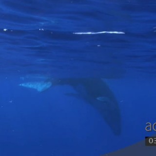 Humpback whale calf swimming down two adults watching over the young swimming UW