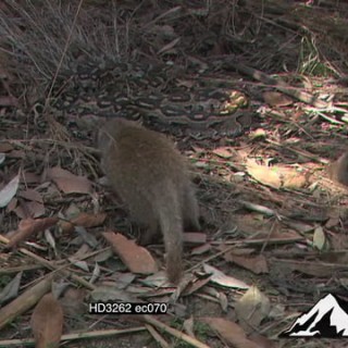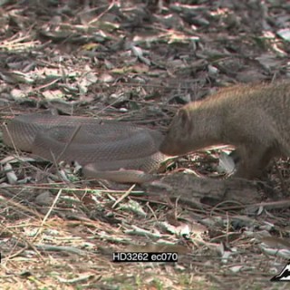 Select options DownloadBanded Mongoose walking searching in bushveld woodland, attacking Olive House Snake protecting young from snake.
