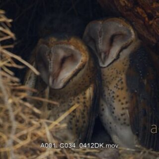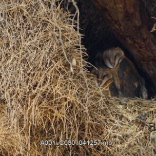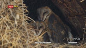 Medium shot of barn owl family in nest