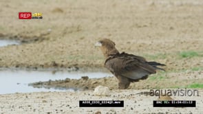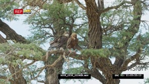 Bateleur eagle and Tawny eagle preening, sitting on top of the tree branches and looking around.