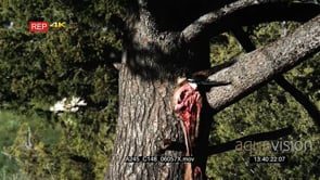 Magpie standing on tree eating Elk carcass hanging MLS