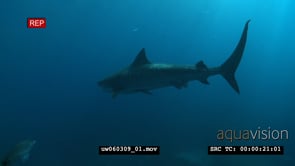 Tiger Shark swimming underwater in ocean passing by a school of Blacktails LA WS HAND