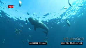 Tiger Shark with Remora Fish swimming underwater in ocean passing by a school of Blacktails MWS MS PAN HAND