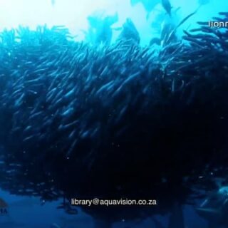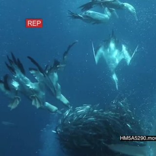 Swimming down Cape Gannets feeding on Sardine bait ball, joined by Blacktip Sharks and Skipjack Tuna UW