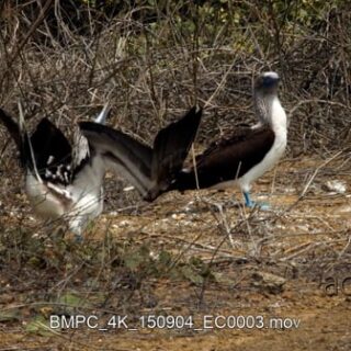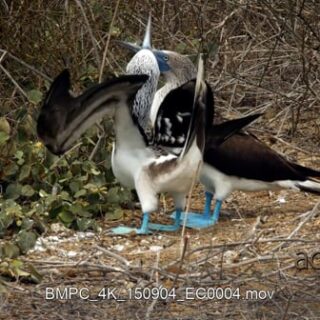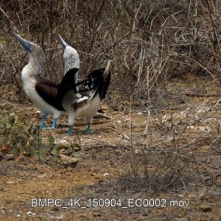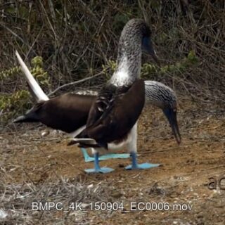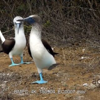 Two blue footed booby’s courting, standing, looking around and walking out of frame.