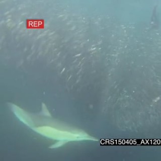 Cape Fur seals flipping playing near camera Common Dolphins feeding off Sardine baitball as Bryde’s Whale passes by below UNDERWATER HANDHELD