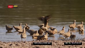 Burchell’s sandgrouse bird drinking and bobbing others land