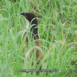Burchell’s coucal walking among the grass, foraging and looking around.