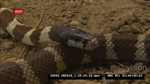 California Mountain kingsnake hunting and catching mouse, CU of face, feeding on mouse