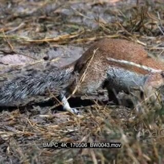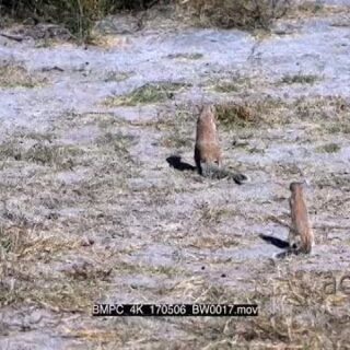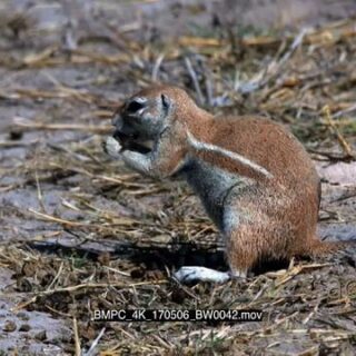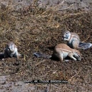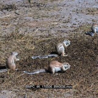 A group of cape ground squirrels searching through a pile of buck dropping picking one at a time and eating them, they suddenly get a freight and run away