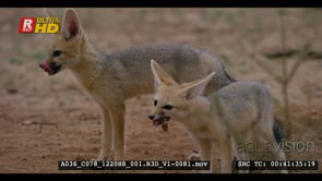Close up shot of juvenile cape fox chewing a piece of intestine while sibling watches