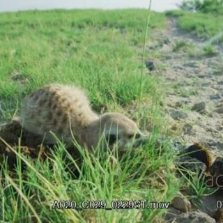 Meerkat chewing, digging a burrow and walking away from the camera.