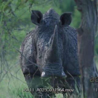 Muddy White rhinoceros standing, chewing grass and walking away from the frame.