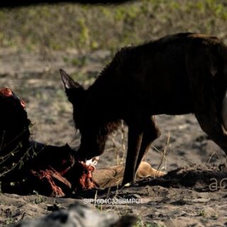Select options DownloadTwo adult Spotted Hyena standing, dragging while feeding on the African Elephant carcass remains and running off frame, MLS; LATE AFTERNOON.
