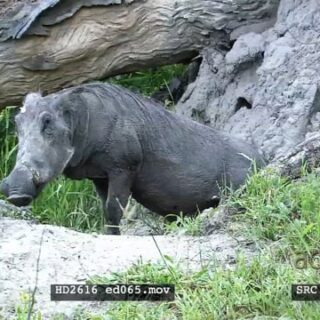 Female warthog reverses into burrow den, with her head facing the opening and ready to burst out if necessary.