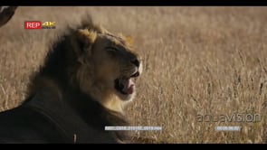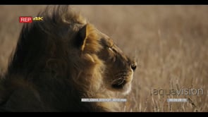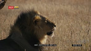 Close up super slow motion side view shot of the face of a male lion with its black mane sneezing