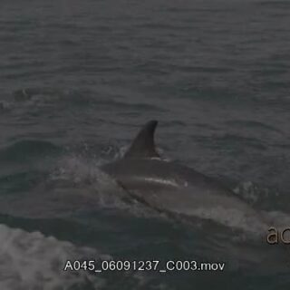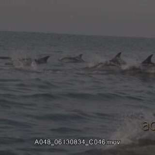 A pod of energetic Common Dolphin swimming, breaching and their dorsal fin above the water surface.