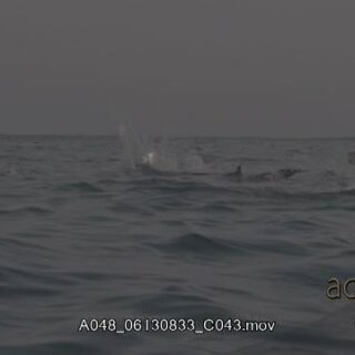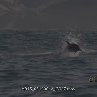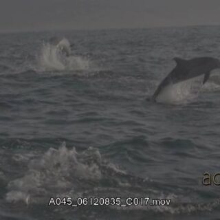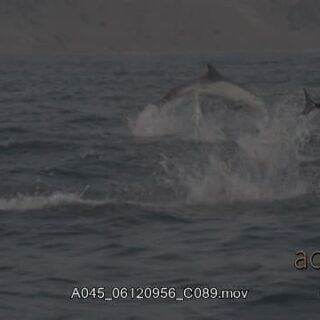Energetic Common Dolphin pod jumping, breaching and twisting while above water surface.