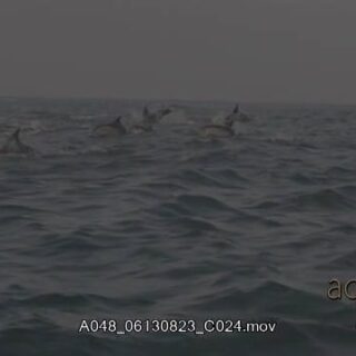 A pod of active Common Dolphin jumping, leaping and breaching while above the water surface.