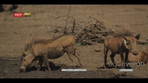 Warthogs standing drinking from waterhole and laying down on veld with Redbilled Oxpecker moving on one of them