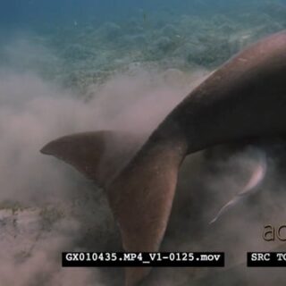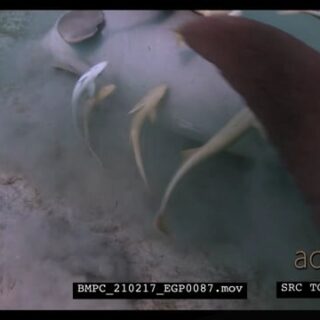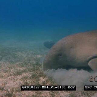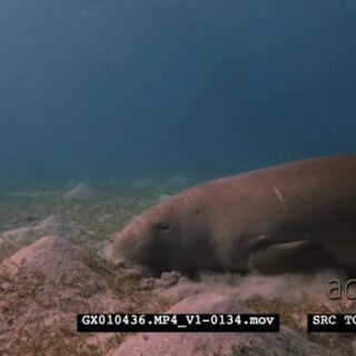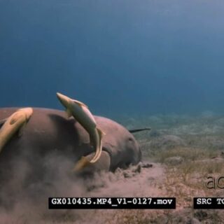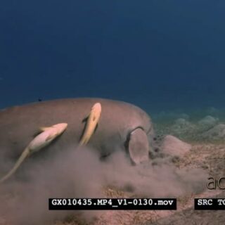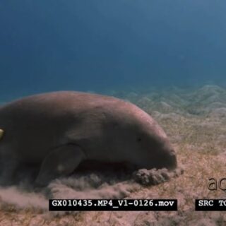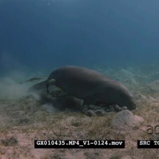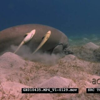 A Close Up shot of a Dugong eating eating sea grass, rolling on the sea bed trying to get rid of itself of Remora.