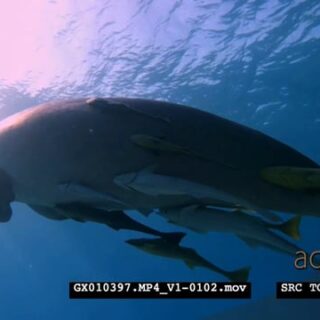 Close up shot of a dugong eating, then it swims off to the surface where snorkelers watch it from above