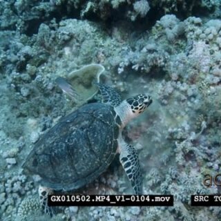 A shot from above of a hawksbill turtle eating soft coral