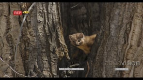 Pine Marten eating and looking at camera on tree MLS
