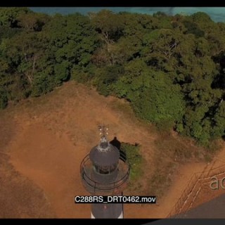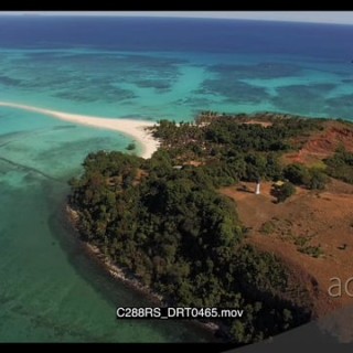 AERIAL of the Madagascar Island and a light house on the island GREEN