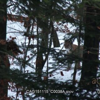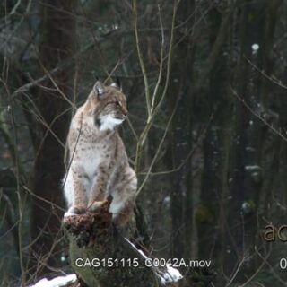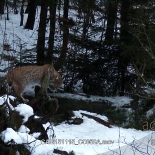 Eurasian Lynx walking and looking around in snowy forest.