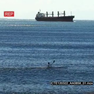 Ship in BG as man paddles across ocean in a canoe