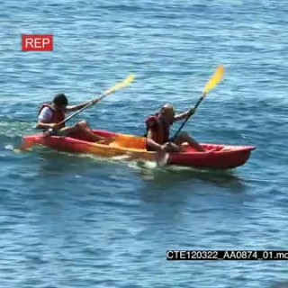 People canoeing across ocean in FG with ship in BG