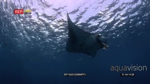 Tracking shot reef manta ray followed glides/swims in the blue