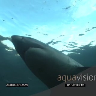 Select options DownloadGreat White Shark gently swimming underwater in ocean passing by school of Strepies and camera MLS TU PAN HAND