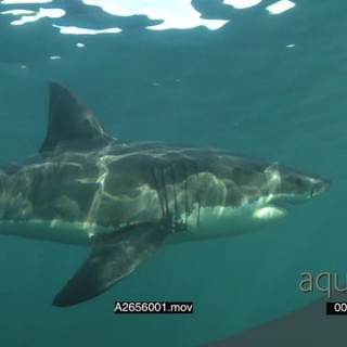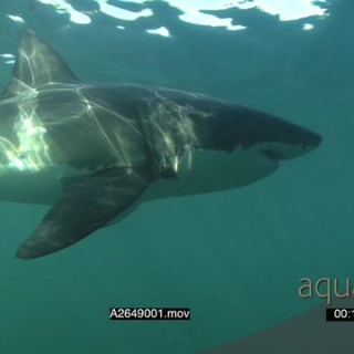 Great White Shark gently swimming underwater in ocean passing by the camera LA PAN HAND