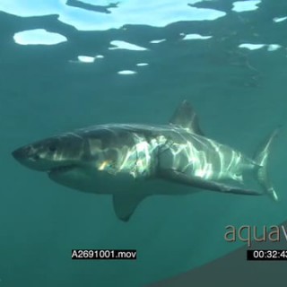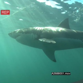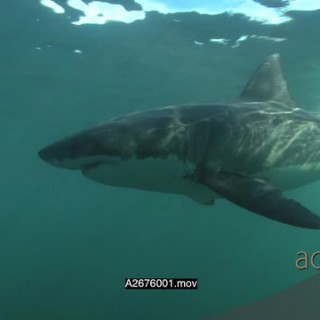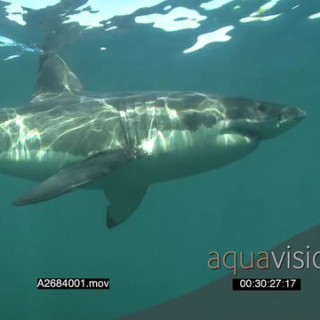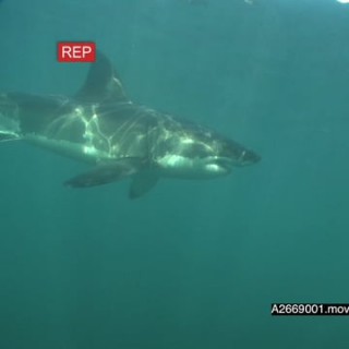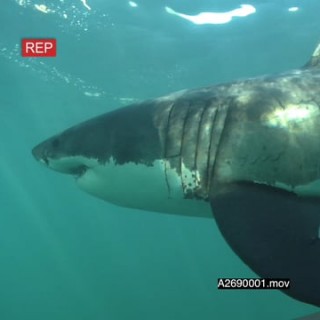 Great White Shark gently swimming underwater in ocean passing by the camera HAND