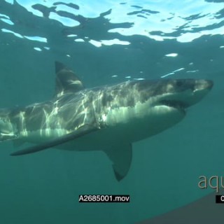 Great White Shark gently cruising around underwater in ocean passing by the camera LA PAN HAND