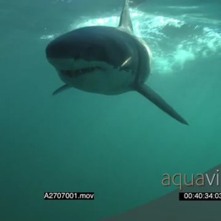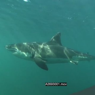 Great white shark gently swimming towards boat underwater in ocean passing by the camera PAN TU LA HAND