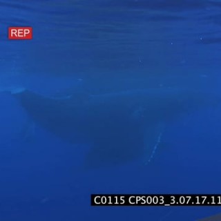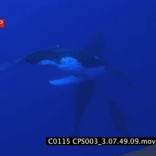 Humpback whale calf swimming up and the adults looking over the calf UW