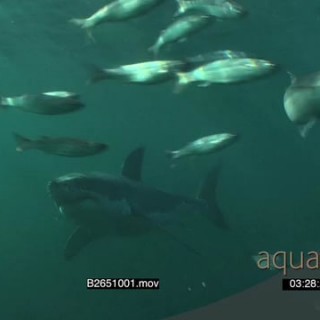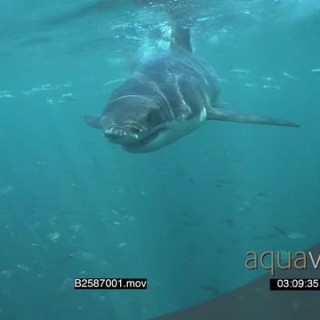 Select options DownloadA Great white shark gently swimming underwater in ocean passing by camera through school of Fransmadams UW HAND