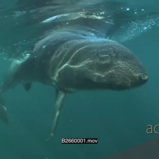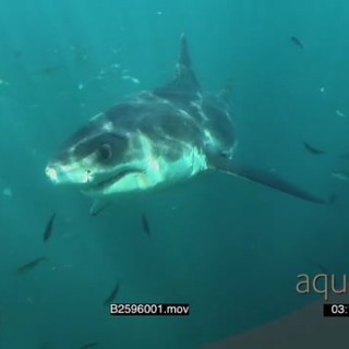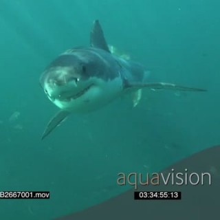 Select options DownloadA Great white sharks gently swimming underwater in ocean passing by camera UW HAND
