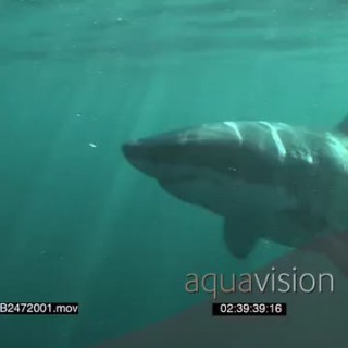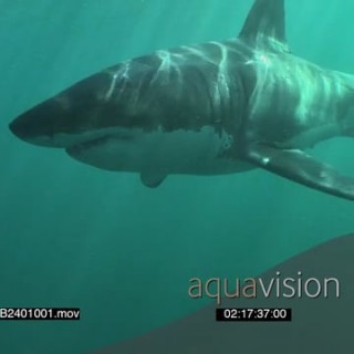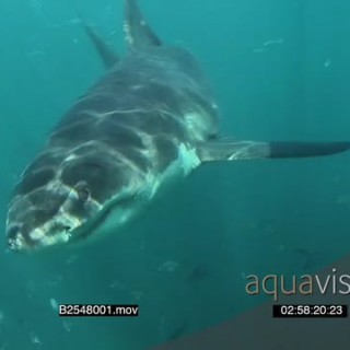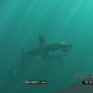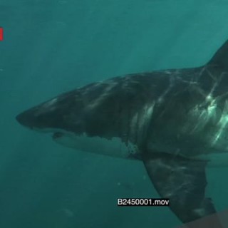 Select options DownloadA Great white shark gently swimming underwater in ocean then turning and passing by camera UW HAND