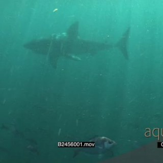 Select options DownloadA Great white shark gently swimming underwater in ocean passing through school of Cape Silversides UW HAND