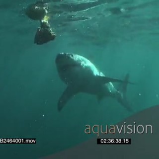 Select options DownloadGreat white shark swimming underwater in ocean and crashing into boat trying to bite a bait line UW HAND